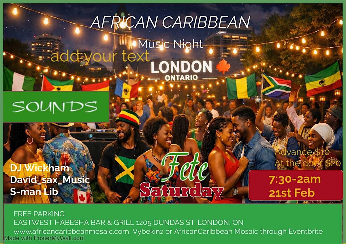 Experience the ultimate vibe! African & Caribbean beats by DJ Wickham & more. Feb 21 | 7:30PM 1205 Dundas St, London ️ $10 Adv