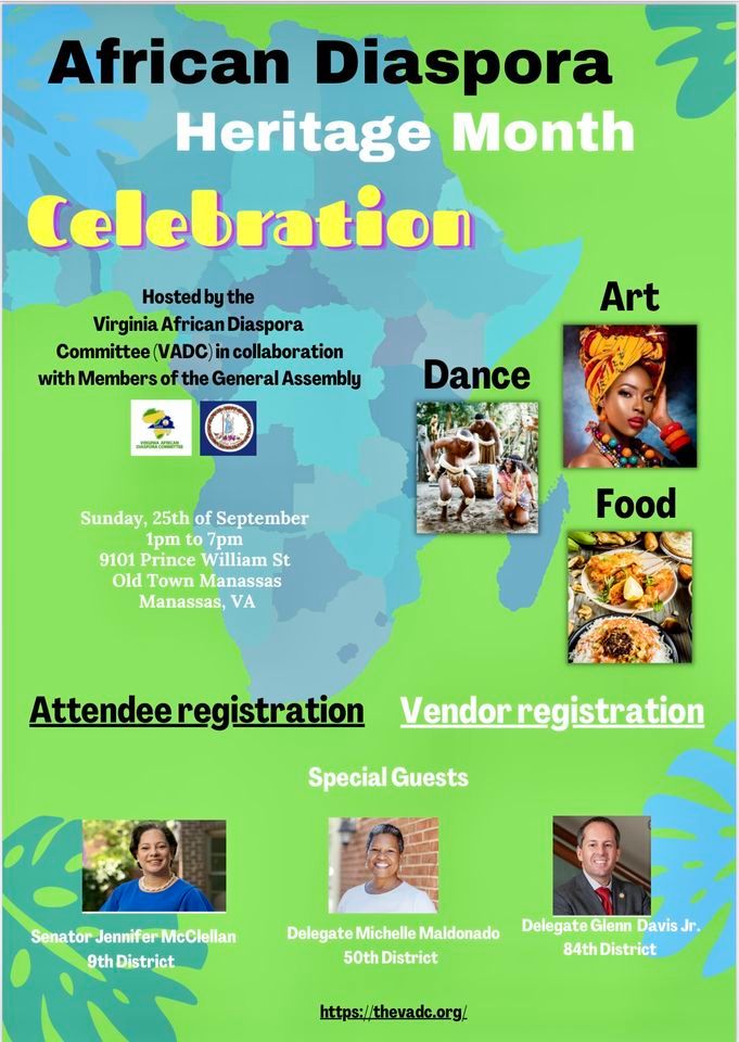 It is with great pleasure that we share that Virginia Delegate Michelle Maldonado, State Senator Jennifer McClellan, and Delegate Glenn R. Davis Jr., will co-host our inaugural African Heritage Month celebration with the Virginia African Diaspora Committee (VADC) on September at Manassas Museum Lawn.We invite you to join us for this historic event. We are soliciting for African food, clothing, and other vendors and performances (musical, dance, or narrative) to showcase our diverse cultures. Please let us know if you are interested in being a vendor or performer or if you know of others who would be interested.