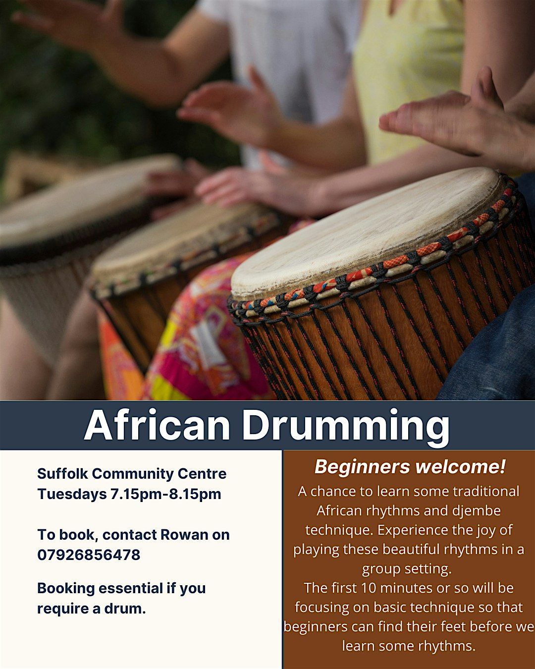 A chance to learn some traditional African rhythms and djembe technique. Experience the joy of playing these beautiful rhythms in a group setting.