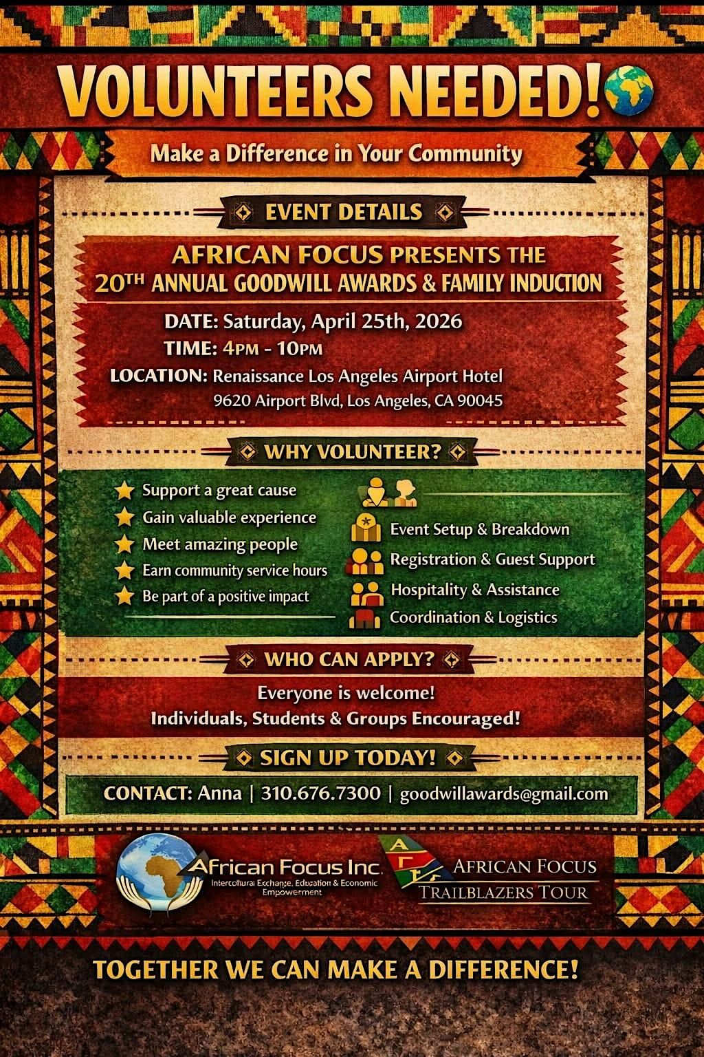 VOLUNTEERS NEEDED! Event setup and breakdown. Registration and hospitality. General production support. Contact Anna 310-676-7300.About this Event