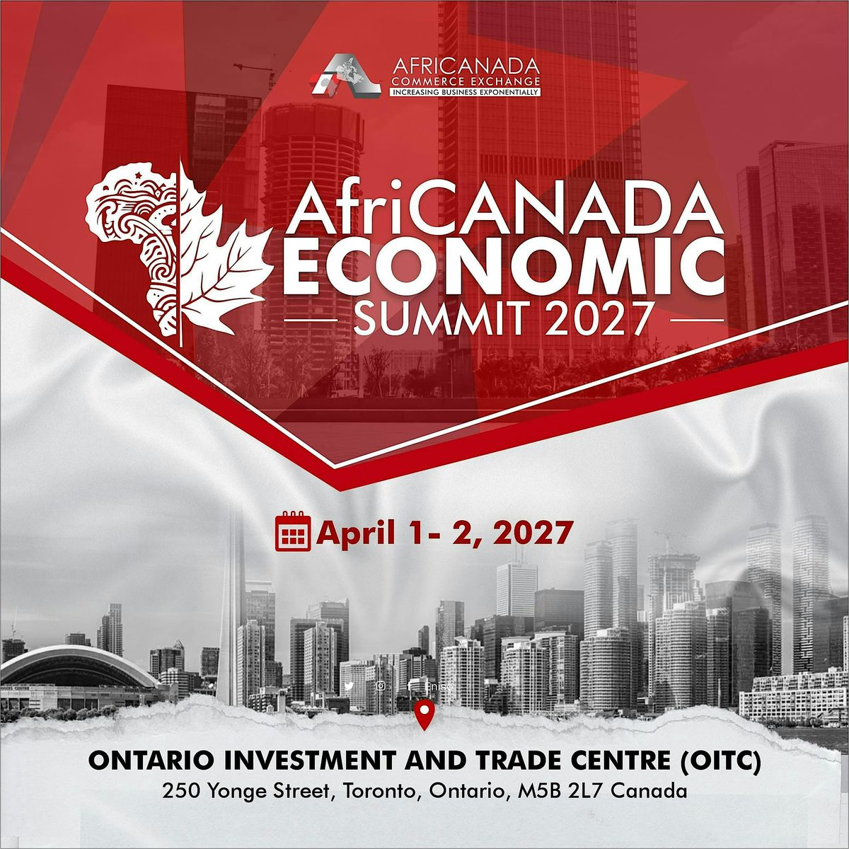 The AfriCanada Economic Summit 2027, scheduled for April 1-2, 2027, at the Ontario Investment and Trade Centre (OITC) in Toronto, will build on the strong outcomes of the 2026 edition by advancing actionable partnerships, investment opportunities, and policy collaboration between Canada, Africa, and the Caribbean.
