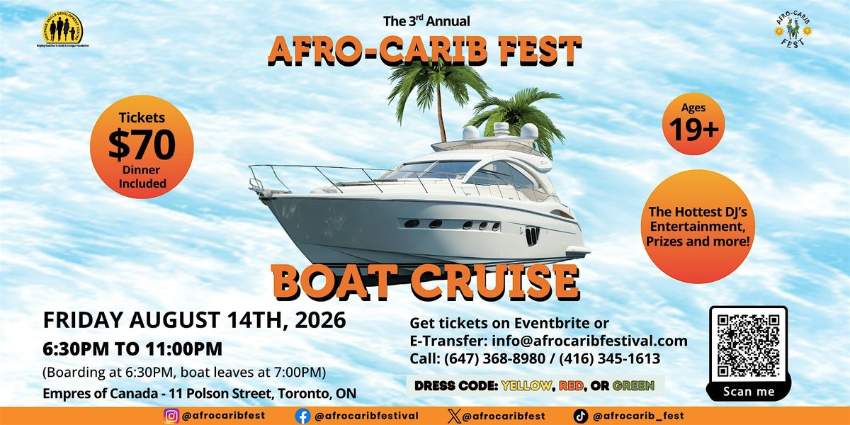Toronto, the wait is over! The highly anticipated 3rd Annual Afro-Carib Fest Boat Cruise is BACK, and this year, we're taking it to new heights. Get ready for an unforgettable night of the hottest DJs, delicious food, non-stop entertainment, and breathtaking views of the city skyline as we set sail aboard the magnificent Empress of Canada. π’