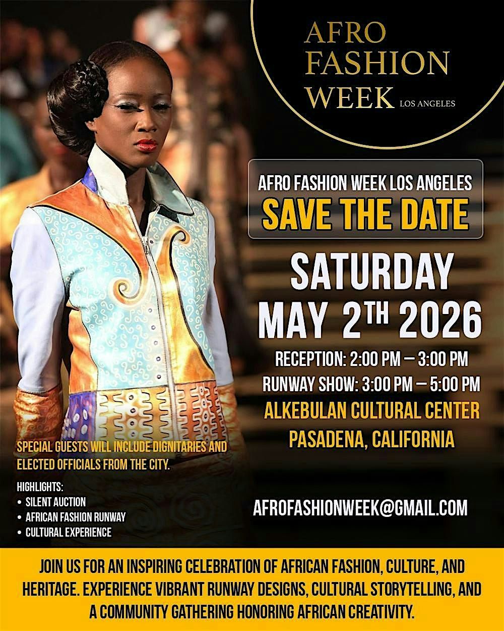 Join us for an unforgettable cultural experience at Afro Fashion Week Los Angeles 2026, where fashion, art, music, and heritage come together to celebrate the richness and innovation of African and diasporic creativity.