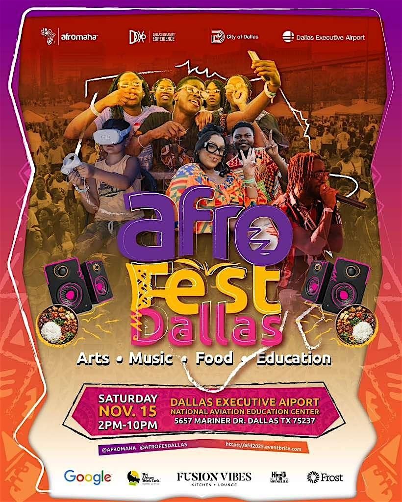 The 2nd Edition AFRO FEST Dallas is Saturady OCTOBER 17th, 2025 from 2PM to 10PM at the Henry B Tippie (NAEC) at Dallas Executive Airport 5657 Mariner Dr, Dallas, TX 75237