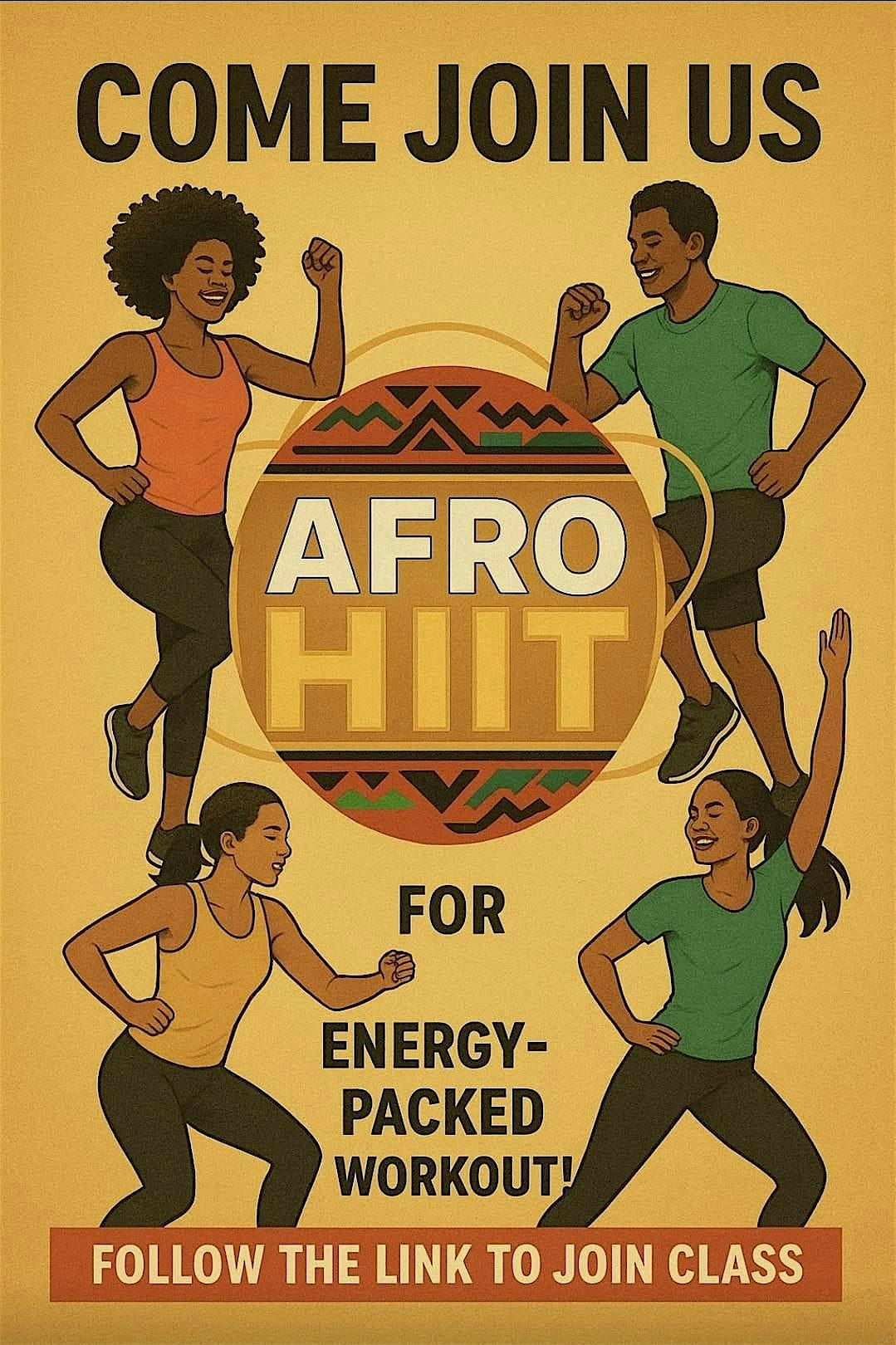 Come join us for an energetic workout session combining Afro dance moves with HIIT exercises! Get ready to sweat and groove to the rhythm of the music. No dance experience required, just bring your positive energy!
