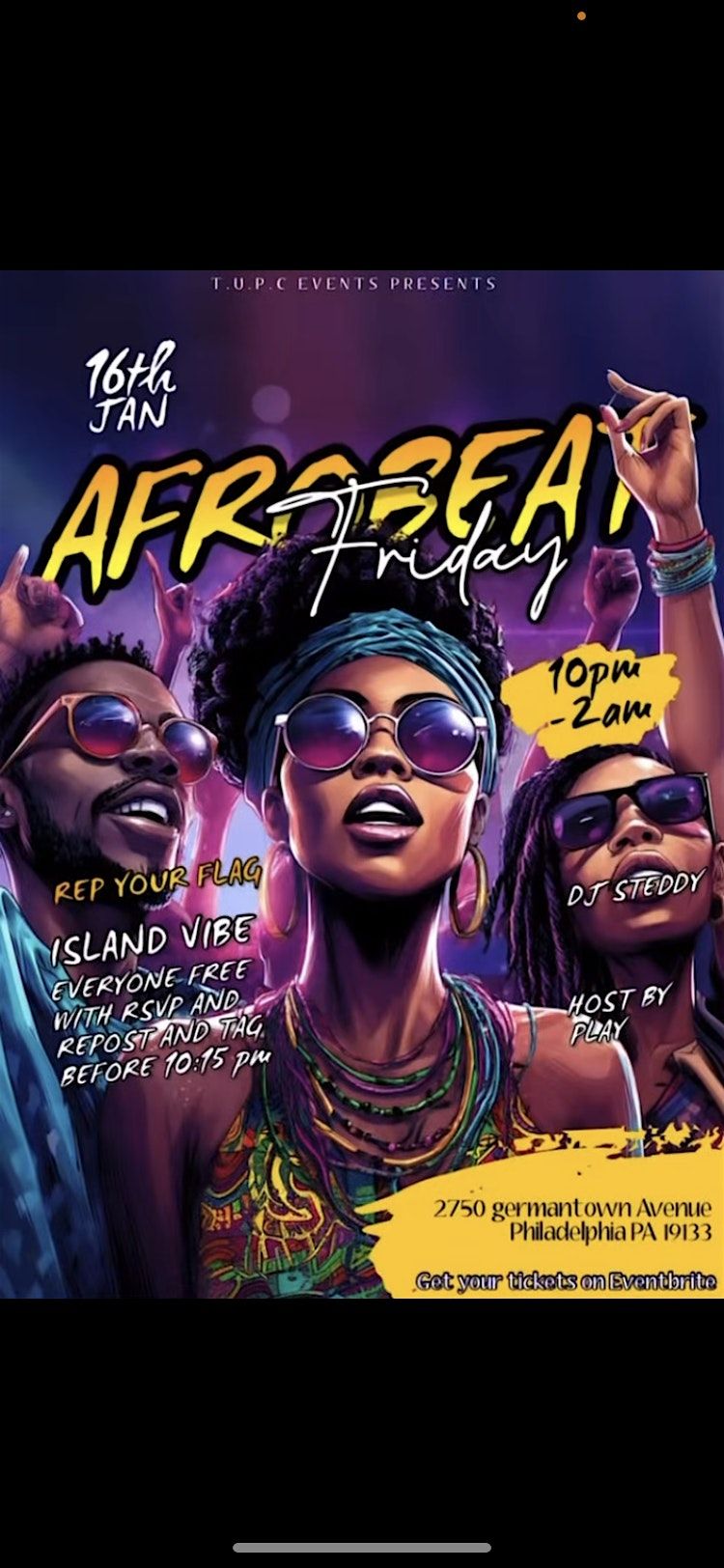 Welcome to the Afrobeats Event happening at 2750 Germantown Ave on January 16, 2026 at 10:00 PM (Eastern Time)! Get ready to groove to the vibrant sounds of Afrobeats music and immerse yourself in some Reggae, Soca, Dembow and Kompa. Join us for a night filled with crazy energy and to show off those hips. Don't miss out on this opportunity to experience the infectious rhythms that will have you dancing all day long. See you there lets whine the night away untill our hips fall off.