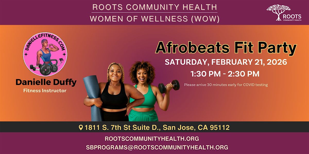 Join Roots Community Health and fitness instructor Danielle Duffy of Pacific Spin & Strength for an Afrobeats Fit Party! Turn up the music and get your heart pumping! This fun, high-energy Afrobeats-inspired cardio class with options for all fitness levels. Expect great vibes, big movement, and an unforgettable sweat session.