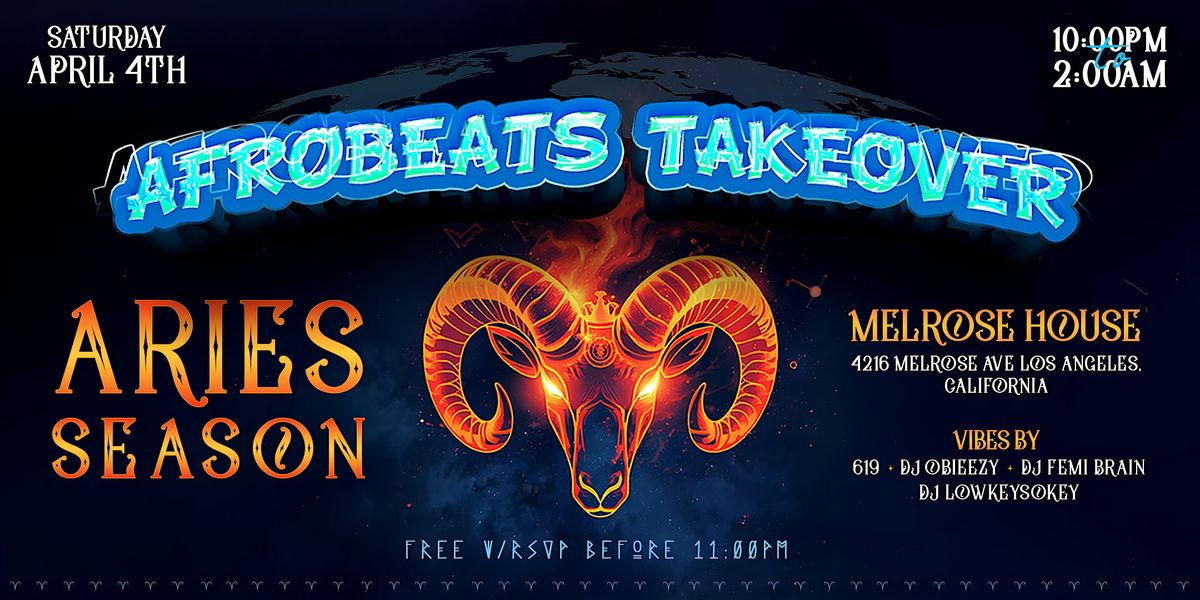 Get ready to vibe at 4216 Melrose Ave on April 4, 2026 at 10:00 PM (PDT)! We're bringing the hottest Afrobeats beats to celebrate Aries Season. Come dance, chill, and enjoy an epic night with friends. Don’t miss out on the energy and good times—this is the place to be!
