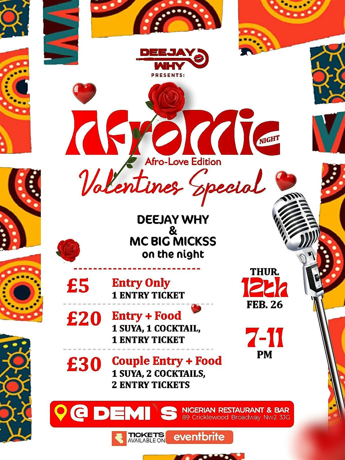 Get ready for an unforgettable evening at AFROMIC NIGHT! This is your chance to dive into the vibrant beats and electrifying vibes of Afrobeats, over food, drinks & singing. Come dance, mingle, and soak up the awesome atmosphere with friends. Whether you're a die-hard afrobeats fan or just looking for a fun night out, AFROMIC NIGHT is where you wanna be!