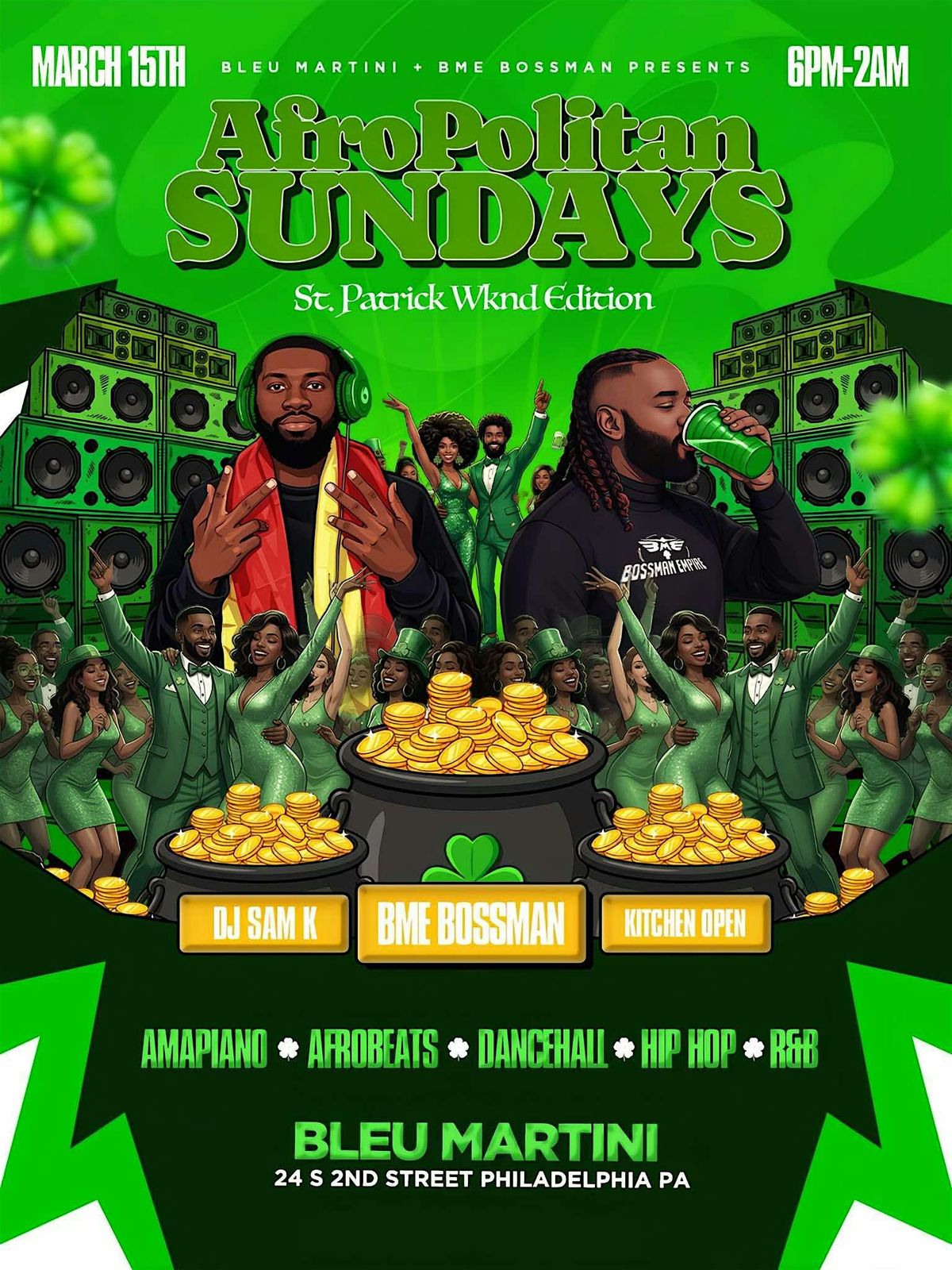 Get ready to party at Bleu Martini on March 15, 2026 at 10:00 PM (Eastern Time)! Join us for a fun and lively St Patrick’s Day celebration with an Afropolitan twist. Expect great vibes, cool people, and plenty of good times. Don’t miss out on this awesome night to mix, mingle, and dance. See you there!