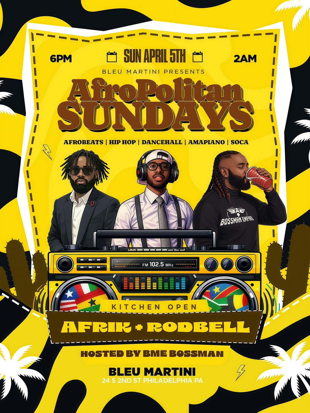 Get ready for a chill night at Bleu Martini on April 5, 2026 at 10:00 PM (ET). Join us for an awesome mix of vibes, great music, and cool people. Whether you're here to dance or just kick back, Afropolitan Sunday is the place to be. Don’t miss out on a night full of good times and good company!