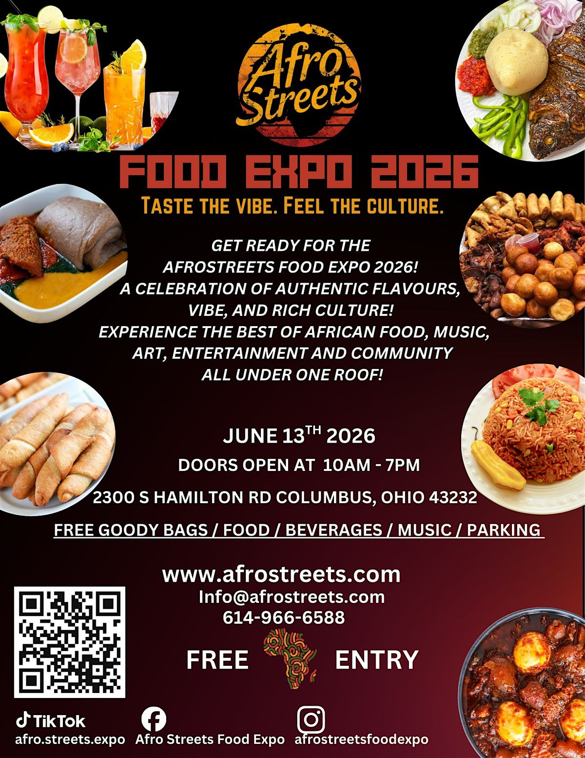 AfroStreets Food Expo 2026, A Vibrant and Culturally Rich Event that celebrates African and Diaspora Cuisine, Music, and Community. We are excited to host our upcoming expo in Columbus, Ohio, bringing together Food Lovers, Vendors, and Families for an Unforgettable Experience.
