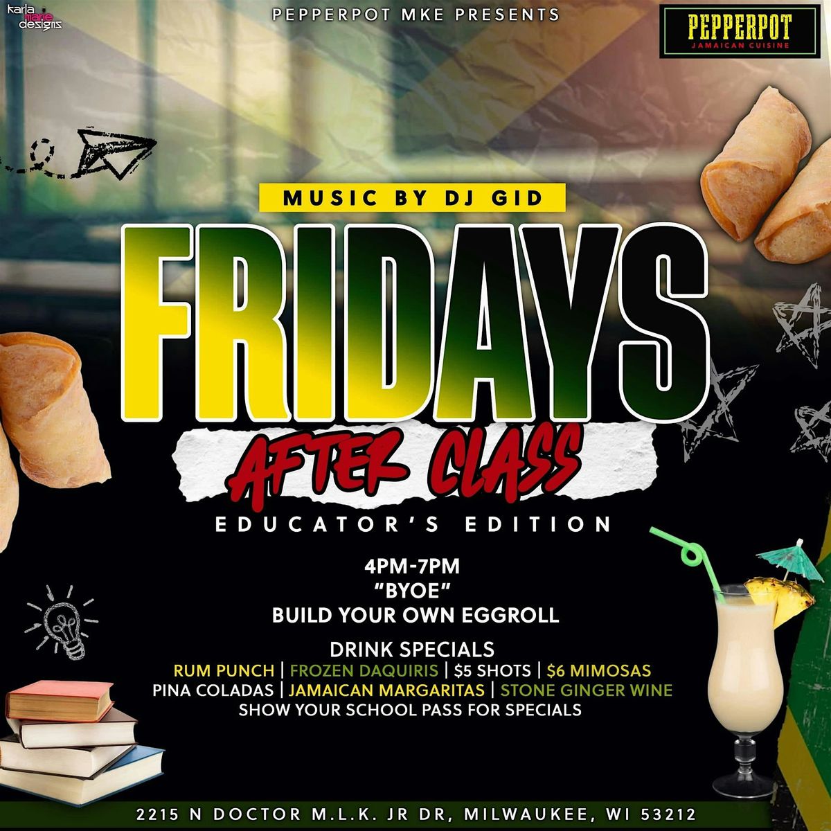 Welcome to After Class - The Educators After Work Set! Join us at Pepperpot on MLK for a fun-filled evening of mingling, networking, and unwinding after a long day of teaching. This event is the perfect opportunity to connect with other educators, share stories, and relax in a laid-back setting. Whether you're a teacher, professor, or education enthusiast, this event is for you! Come join us for a well-deserved break and enjoy the company of like-minded individuals. Enjoy Jamaican Cuisine, Free parking + Food and Drink Specials See you there!