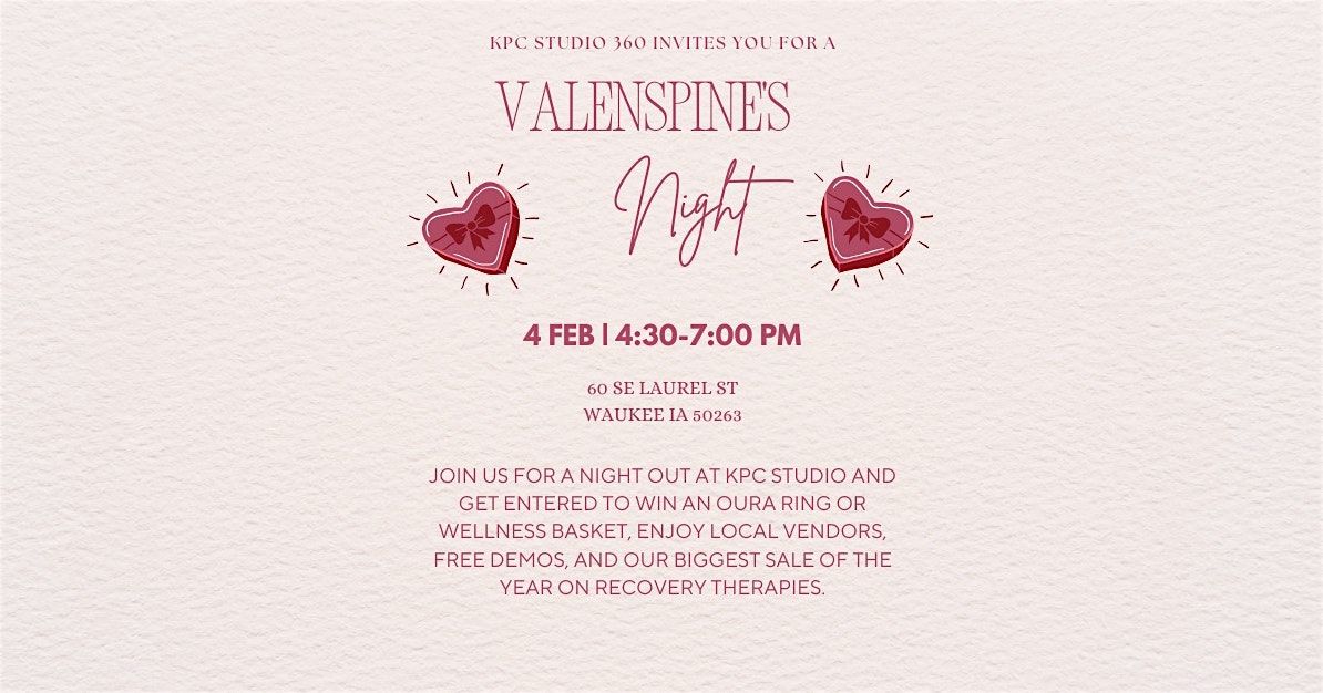 ValenSpine’s Night Out at KPC Studio 360: therapy demos, local vendors, giveaways, charcuterie & drinks come experience recovery, elevated.