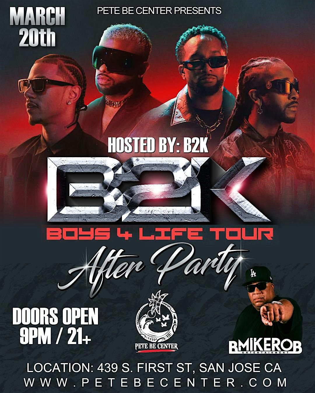 Get ready for the official B2K Boys 4 Life Tour After Party at PETE BE CENTER in San Jose on March 20. B2K will be in the building hosting an unforgettable night of music, celebration, and late-night vibes.