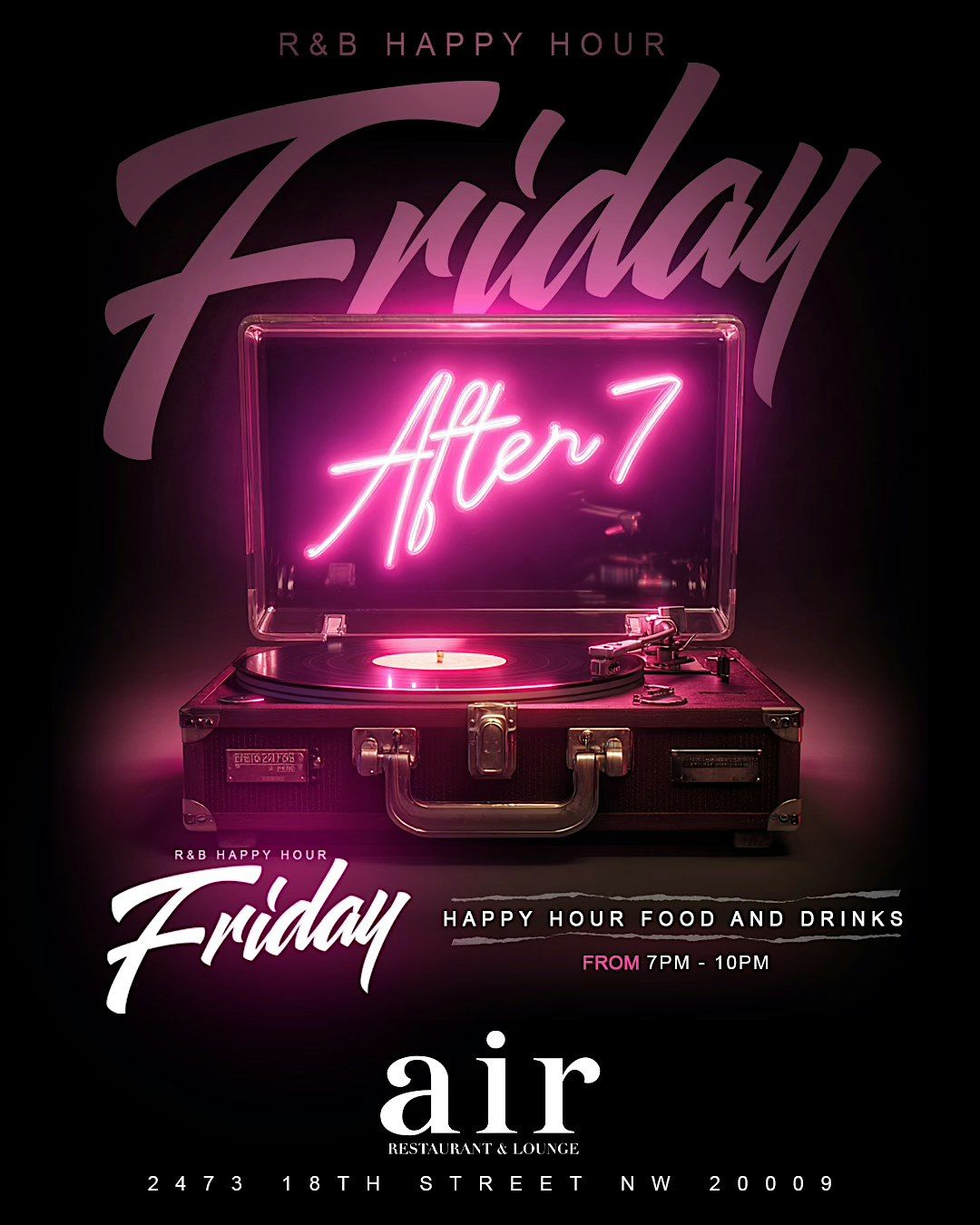 After Seven is a weekly R&B-driven happy hour designed for a smooth start to Friday night. From 7PM–10PM, guests are invited to unwind in an elevated lounge setting with curated R&B sounds, a grown crowd, and a relaxed, intentional vibe.