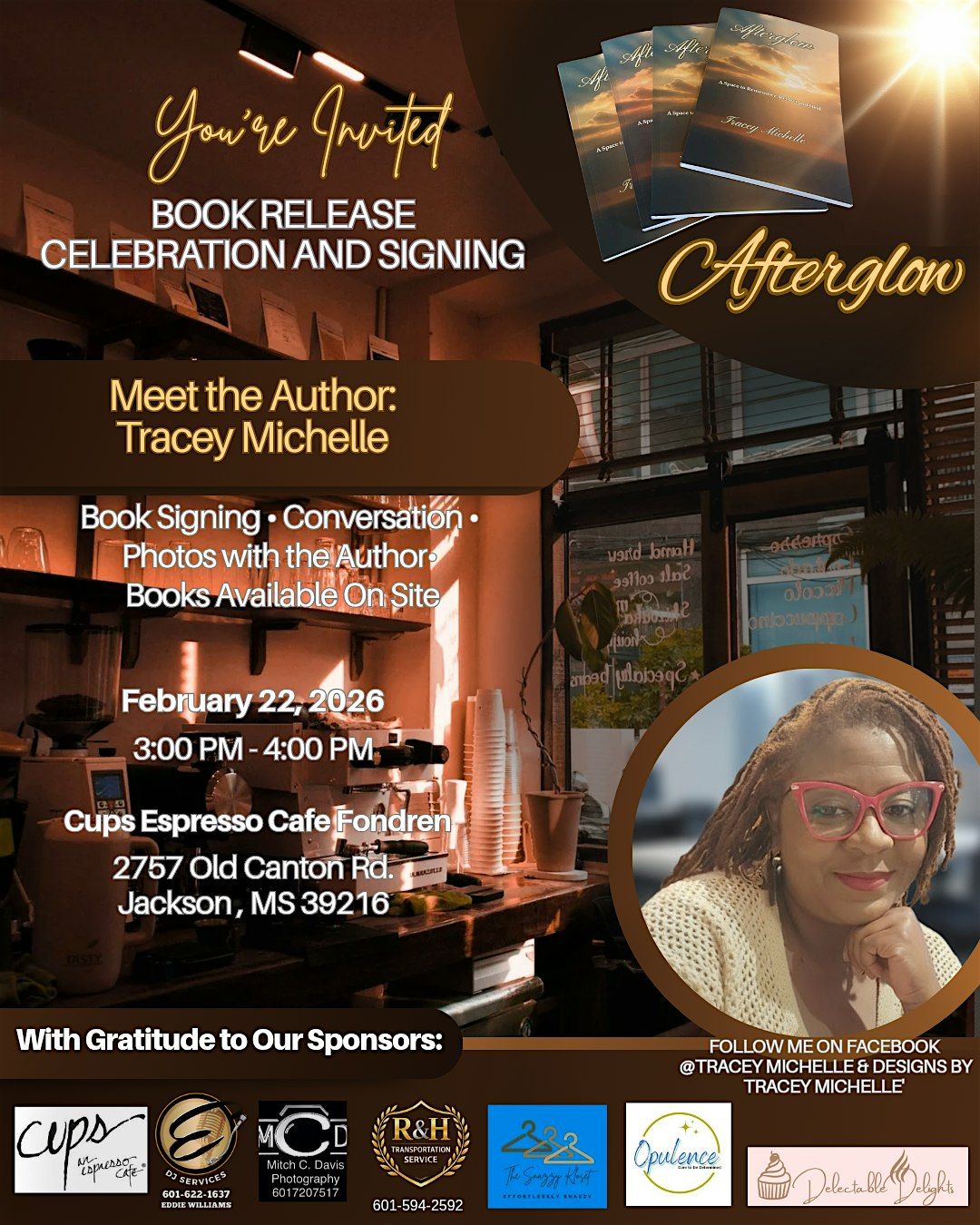 Join author Tracey Michelle for the Afterglow Book Release & Signing, a relaxed and intimate celebration of her latest book, Afterglow. This event offers an opportunity to connect, enjoy meaningful conversation, take photos, and have your book personally signed.