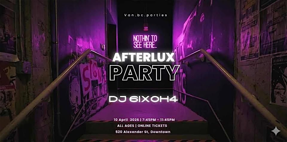 AFTERLUX – April 10 | 7:45PM–11:45AMAll ages party in Gastown,Vancouver.Live DJ 6ix0H4, great vibes, limited capacity.Don’t miss the night.