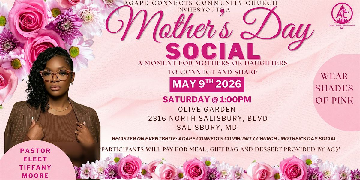 Mothers, daughters, aunts, neices, and gigis! All are invited to Agape Connects Community Church's first Mothers Day Social! Lets eat and spend time honoring the special women in our lives! Participants are asked to wear pink. All participants are asked to pay for their meals. Dessert and gift bag will be provided by AC3. Host: Pastor Elect Tiffany Moore