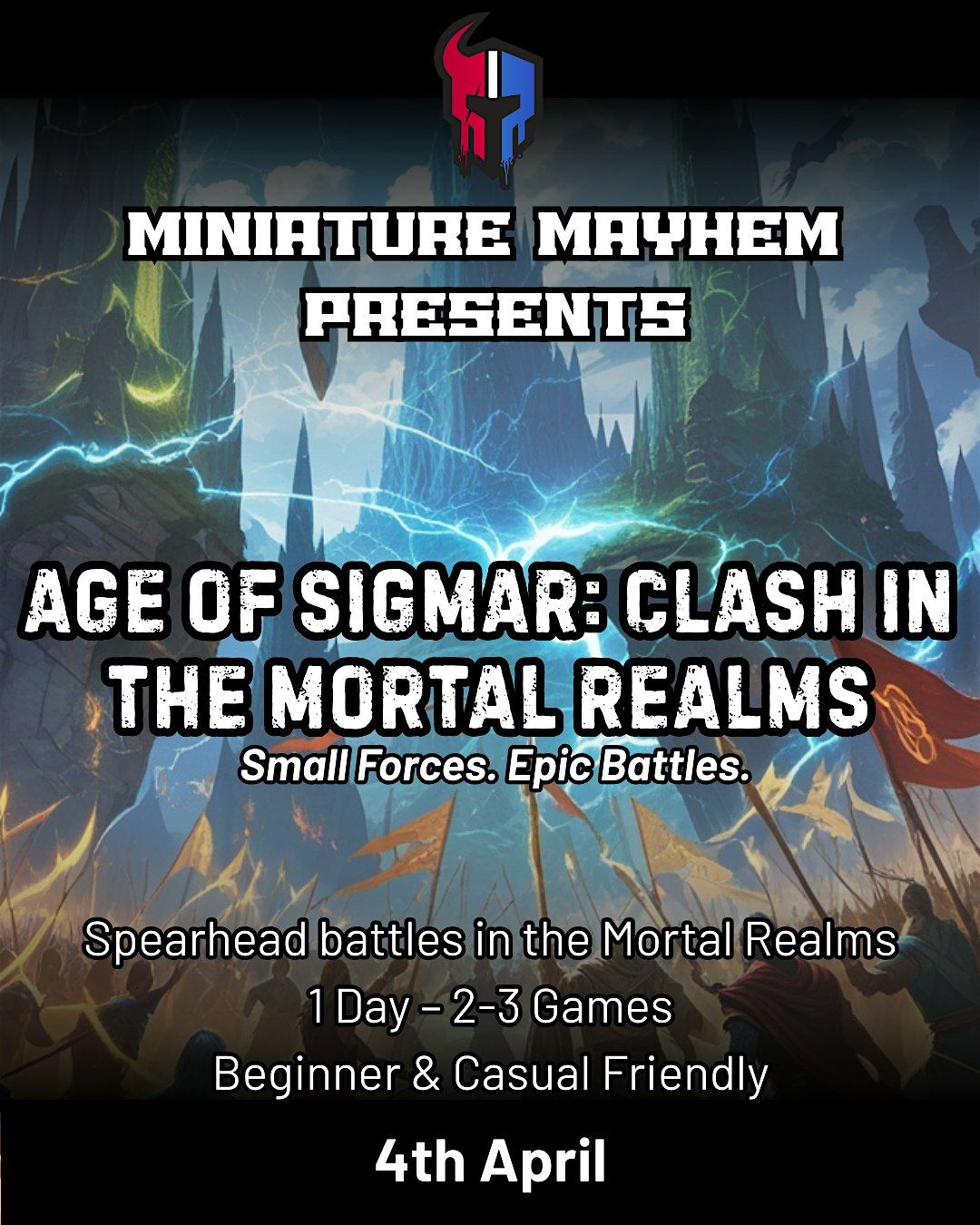 Join us for a day of Warhammer Age of Sigmar Spearhead battles as armies clash across the Mortal Realms! This event is designed to be accessible, fun, and beginner friendly, making it perfect for new players looking to try Spearhead or experienced generals wanting a relaxed day of gaming.