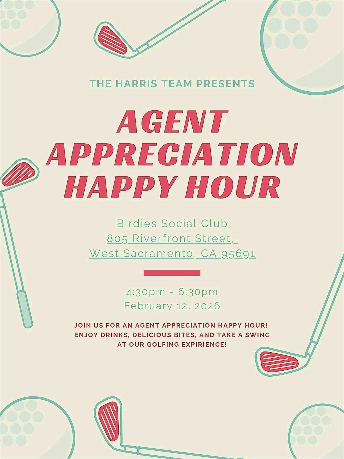JOIN US FOR AN AGENT APPRECIATION HAPPY HOUR!ENJOY DRINKS, DELICIOUS BITES, AND TAKE A SWING AT OUR GOLFING EXPIRIENCE!