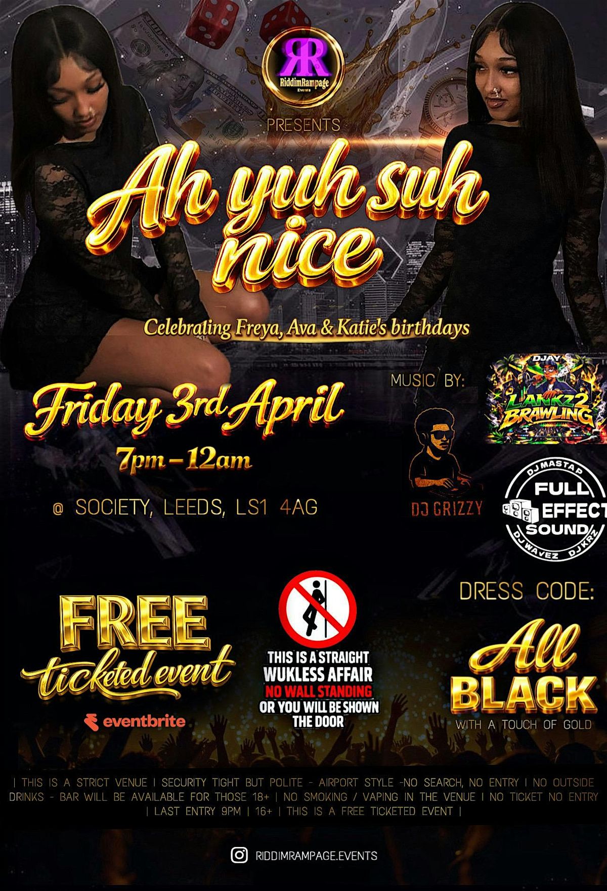 Riddim rampage presents a party called "Ah yuh suh nice" celebrating Freya, Ava and Katie's birthdays! 🎂