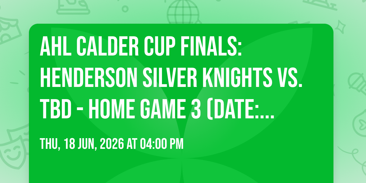 ✨ Enter a world of endless possibilities at AHL Calder Cup Finals: Henderson Silver Knights vs. TBD - Home Game 3 (Date: TBD - If Necessary), where every moment tells a story! 🏛️ The stunning Lee's Family Forum in vibrant Henderson, NV transforms into a realm of wonder on June 18th, 2026 at 04:00 PM. 🌟 They have crafted an experience that goes beyond the ordinary, combining elements of surprise, delight, and pure entertainment. Every detail has been thoughtfully considered to ensure your journey with us is nothing short of extraordinary. 🎯 Join fellow adventure seekers and memory makers in this celebration of imagination and innovation. 🎊 Reserve your spot today and be part of something truly special!http://maps.seatics.com/DollarLoanCenter_Hockey_2022-06-08_2022-06-08_0850_06082022_105204_SVGC_tn.png