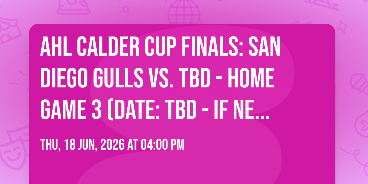 🎉 Prepare to be amazed at AHL Calder Cup Finals: San Diego Gulls vs. TBD - Home Game 3 (Date: TBD - If Necessary), the most anticipated gathering of the season! 🌟 Set against the stunning backdrop of Pechanga Arena - San Diego in vibrant San Diego, CA, this event promises to redefine your expectations. 📅 Mark your calendars for June 18th, 2026 at 04:00 PM and get ready to immerse yourself in an atmosphere of wonder and excitement. ✨ From the moment you arrive, you'll be transported into a world where memories are made and stories come alive. They have crafted an experience that perfectly harmonizes entertainment, innovation, and community spirit. 🌈 Join us as we create moments that will be discussed for years!http://maps.seatics.com/PechangaArena_Hockey_2025-01-06_2024-01-06_1037_01062025_105035_SVGC_tn.png