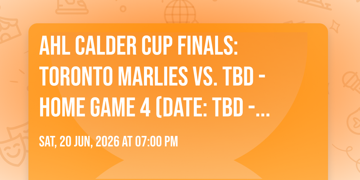 🎉 Prepare to be amazed at AHL Calder Cup Finals: Toronto Marlies vs. TBD - Home Game 4 (Date: TBD - If Necessary), the most anticipated gathering of the season! 🌟 Set against the stunning backdrop of Coca-Cola Coliseum in vibrant Toronto, ON, this event promises to redefine your expectations. 📅 Mark your calendars for June 20th, 2026 at 07:00 PM and get ready to immerse yourself in an atmosphere of wonder and excitement. ✨ From the moment you arrive, you'll be transported into a world where memories are made and stories come alive. They have crafted an experience that perfectly harmonizes entertainment, innovation, and community spirit. 🌈 Join us as we create moments that will be discussed for years!http://maps.seatics.com/RicohColiseum_Hockey_2016-12-09_2016-12-09_1409_SVGC_tn.gif