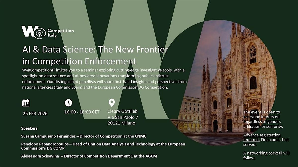 W@CompetitionIT invites you to a seminar exploring cutting-edge investigative tools, with a spotlight on data science and AI-powered innovations transforming public antitrust enforcement. Our distinguished panellists will share first-hand insights and perspectives from national agencies (Italy and Spain) and the European Commission DG Competition.