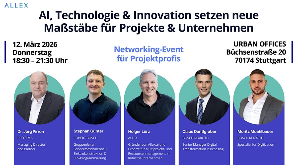 Am 12. März 2026 laden wir zum nächsten Allex.ai Meet-up in Stuttgart ein. Im Mittelpunkt steht hierbei das Thema: "AI, Technologie & Innovation setzen neue Maßstäbe für Projekte & Unternehmen"