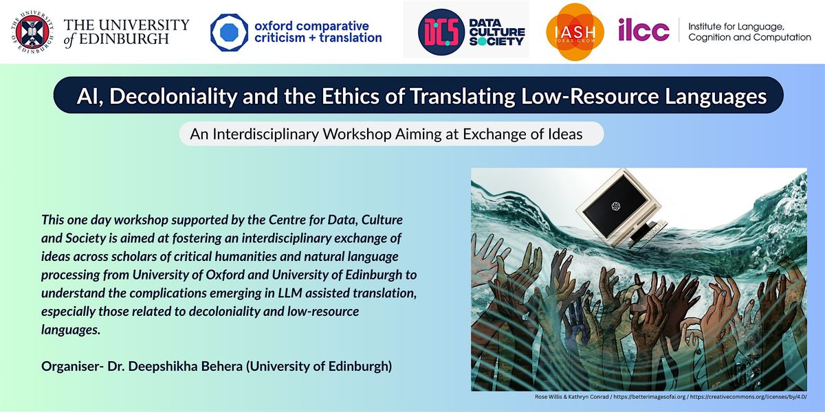 This one day interdisciplinary workshop supported by the Centre for Data, Culture and Society and held in collaboration with Oxford Comparative Criticism and Translation Centre, University of Oxford, Institute for Language Cognition and Computation (University of Edinburgh), the cluster on Creativity, AI and the Human (Edinburgh Futures Institute) and Institute for Advanced Studies in the Humanities is aimed at fostering an interdisciplinary exchange of ideas across scholars of critical humanities and natural language processing to understand the complications emerging in LLM assisted translation, especially those related to decoloniality and low-resource languages.