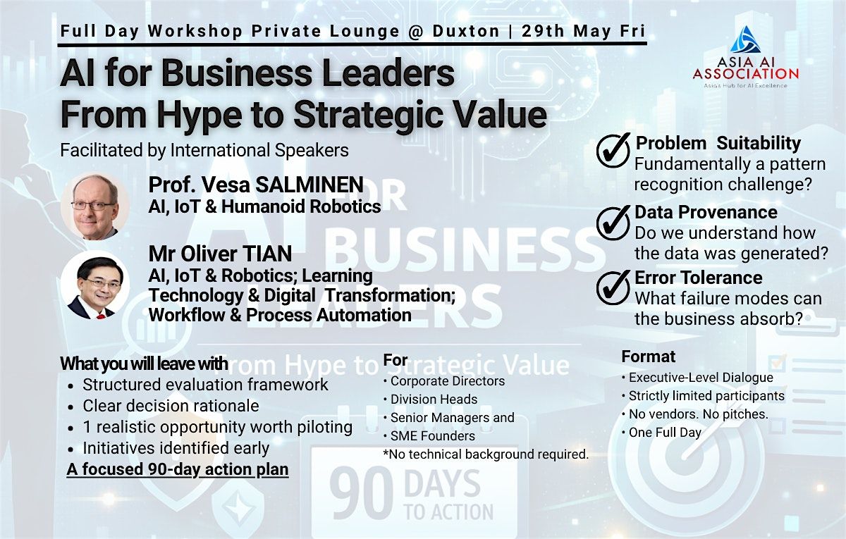 In a world flooded with AI hype, what leaders need is clarity—not more tools. This full-day workshop equips you with practical frameworks to evaluate real business value, align data and risk, and make confident decisions—so you can take meaningful AI action within 90 days.
