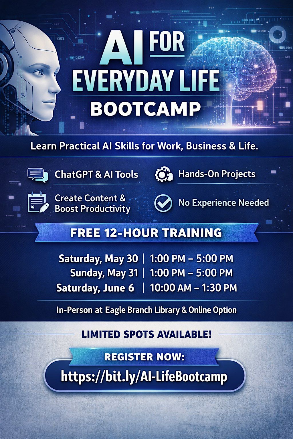 AI for Everyday Life Bootcamp is a free, hands-on training designed to help beginners learn how to use AI tools like ChatGPT for everyday tasks, work, and business.
