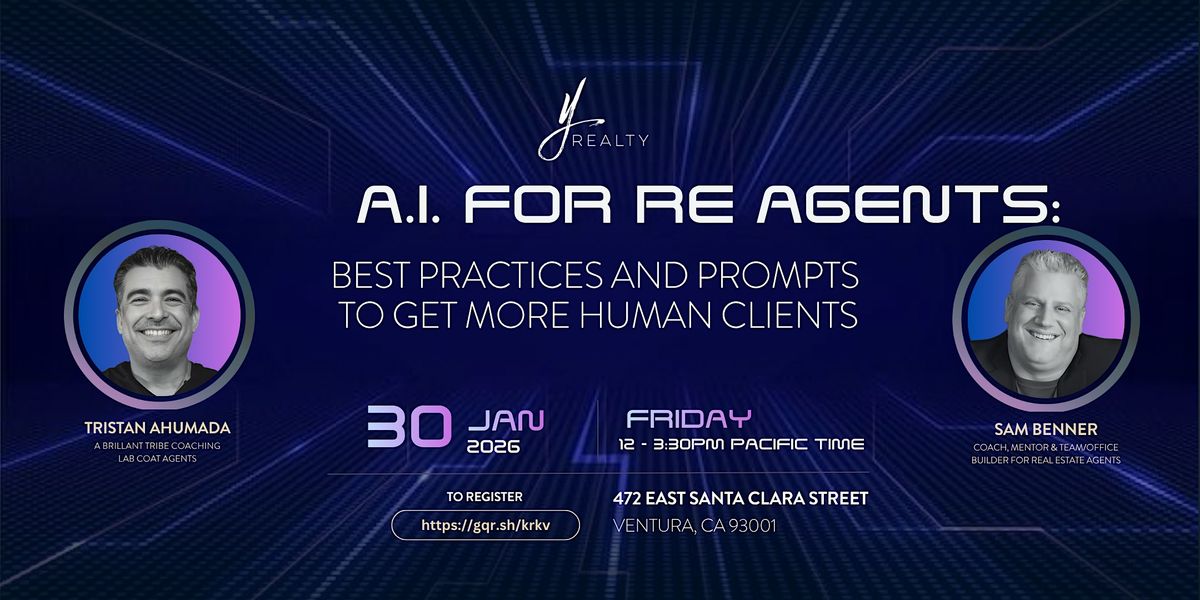 Welcome to the event A.I for RE Agents: Best Practices and Prompts to Get More Human Clients! Join us at 472 E Santa Clara St on December 5, 2025 at 12:00 PM (Pacific Time). Learn how artificial intelligence can enhance your real estate business and attract more clients. Don't miss out on this opportunity to stay ahead in the industry! See you there!