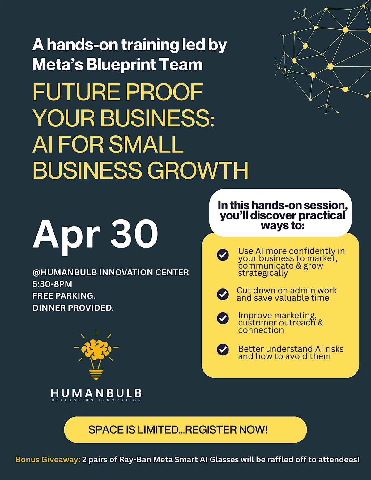 Hosted by HUMANBULB in partnership with Meta’s Blueprint Team, this hands-on session is designed to help small business owners, entrepreneurs, and professionals confidently use AI to grow and scale.