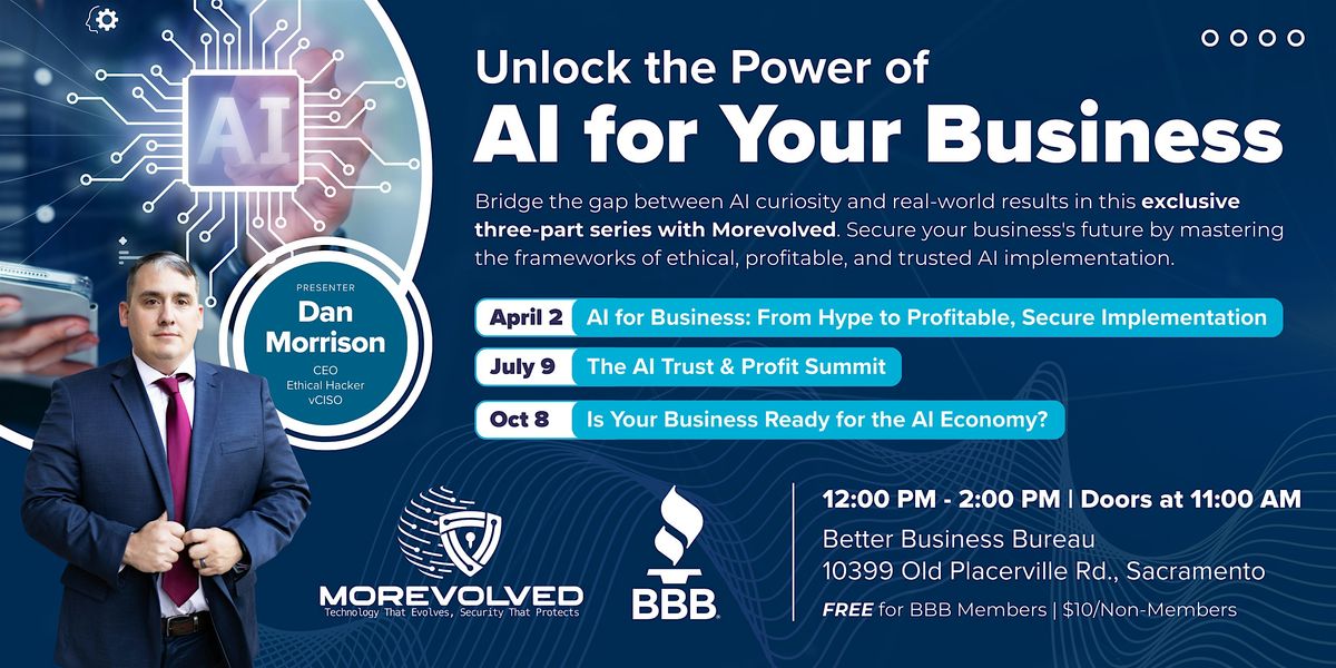 Join the Better Business Bureau of Northeast California and veteran business owner Dan Morrison of BBB-accredited Morevolved for a practical, in-person, 3-part lunch series designed specifically for small and mid-sized business owners who want to incorporate AI into their operations responsibly, securely, and profitably.
