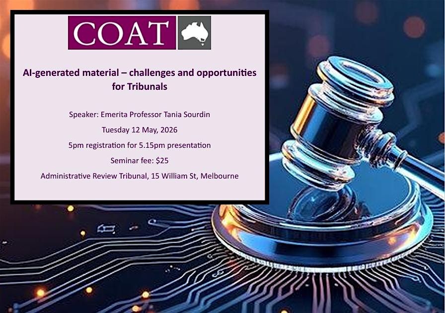 Join COAT at a Twilight seminar for a presentation by Professor Emerita Tania Sourdin on the challenges of AI-generated material in Court and Tribunal proceedings. Tania has experience working in a range of Courts and Tribunals. We will also be exploring the opportunities and challenges AI brings for decision-makers.