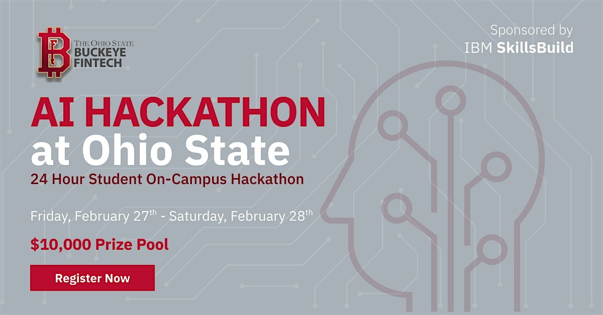 Join us for the AI Hackathon at Ohio State, a 24-hour, in-person student hackathon on February 27th & 28th. Sponsored by IBM SkillsBuild in collaboration with the Buckeye Fintech Group, this event invites college students to build AI-powered solutions to real-world challenges in education and finance.
