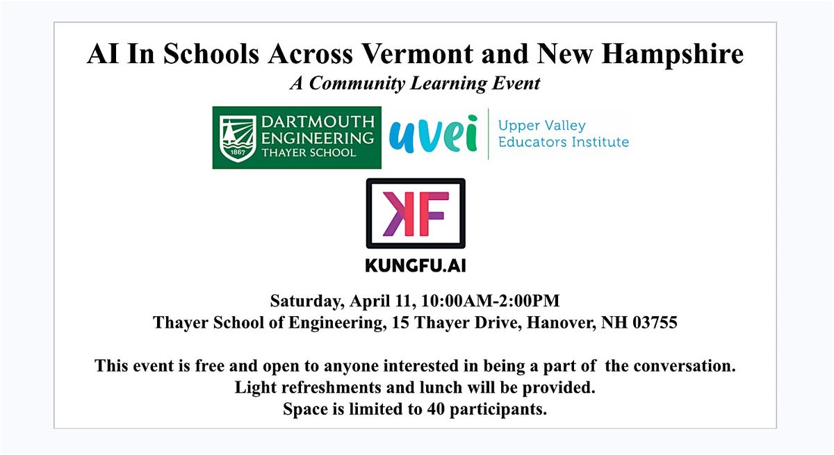 Join us on Saturday, April 11, from 10am-2pm at the Thayer School of Engineering for a day of enjoyable and enlightening conversations about AI and K-12 schools across Vermont and New Hampshire. We have a few activities planned, but we will also facilitate conversations around the questions you’re most curious about (so tell us about those in the registration form or via email!).