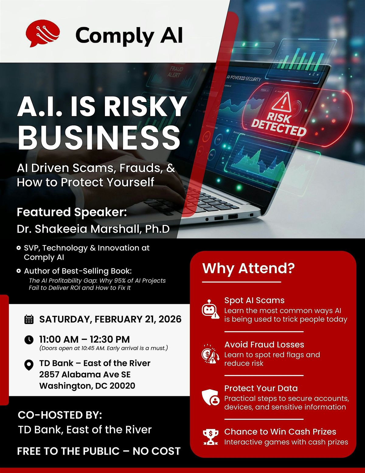 Join Dr. Shakeeia Marshall and Comply AI Solutions for an engaging and practical session designed to help you recognize these threats early and learn how to protect yourself, your business, and your data.