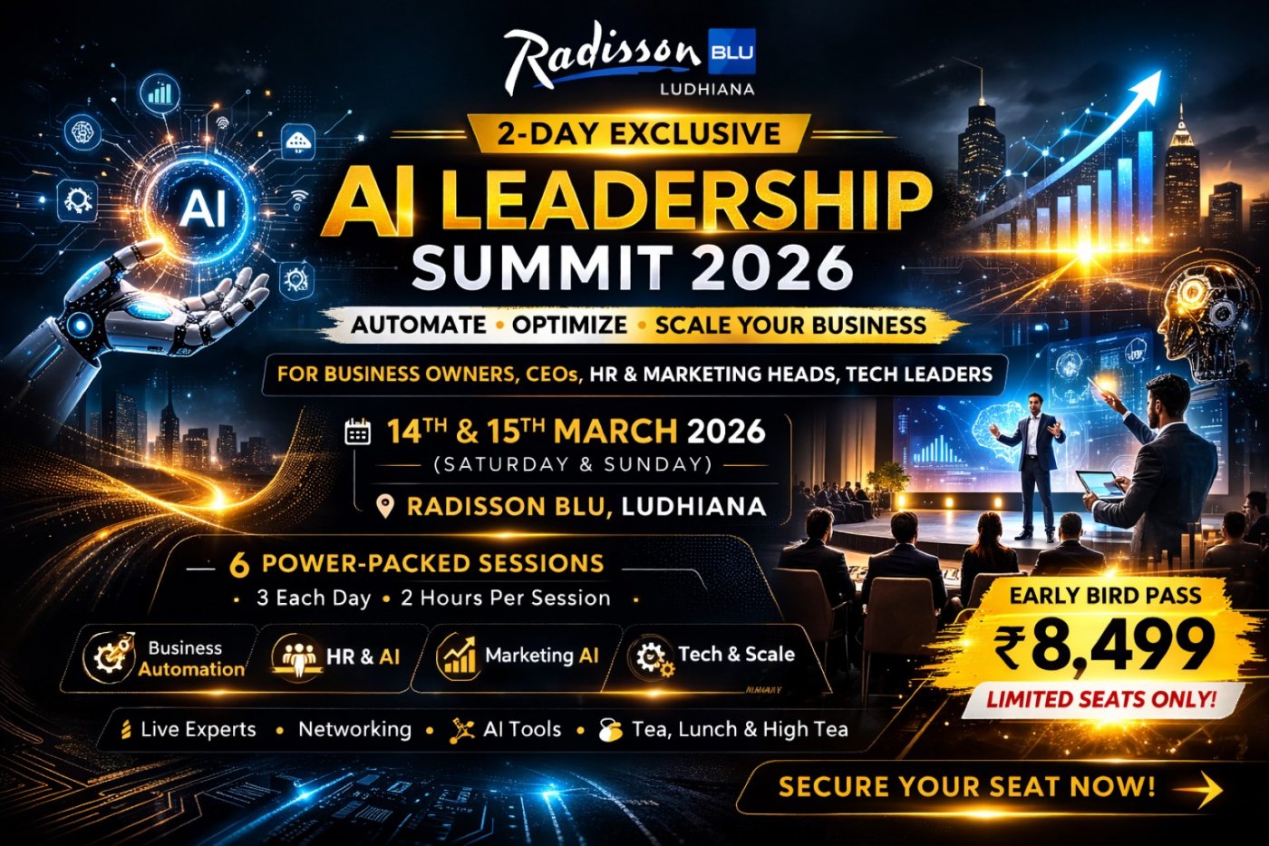 For the first time in Ludhiana, senior business leaders, founders, HR heads, marketing directors, and technology decision-makers are coming together for an exclusive 2-Day AI Summit at Radisson Blu. This is not a beginner’s workshop.