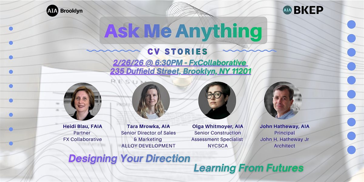 Join the AIA Brooklyn Emerging Professionals Committee (BKEP) for an Ask Me Anything (AMA) panel on Thursday, February 26 at FX Collaborative in Downtown Brooklyn.