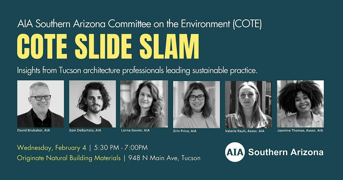 All are welcome to join AIA Southern Arizona Committee on the Environment on Wednesday, February 4 at Originate Natural Building Materials in Tucson for a COTE Slide Slam showcasing insights from Tucson architecture professionals leading sustainable practice and who are advancing environmental responsibility through thoughtful, place-based design and initiatives. Through a series of rapid-fire presentations, they will share projects, strategies, and a snapshot of how sustainability is being translated into real-world solutions across project types and scales.