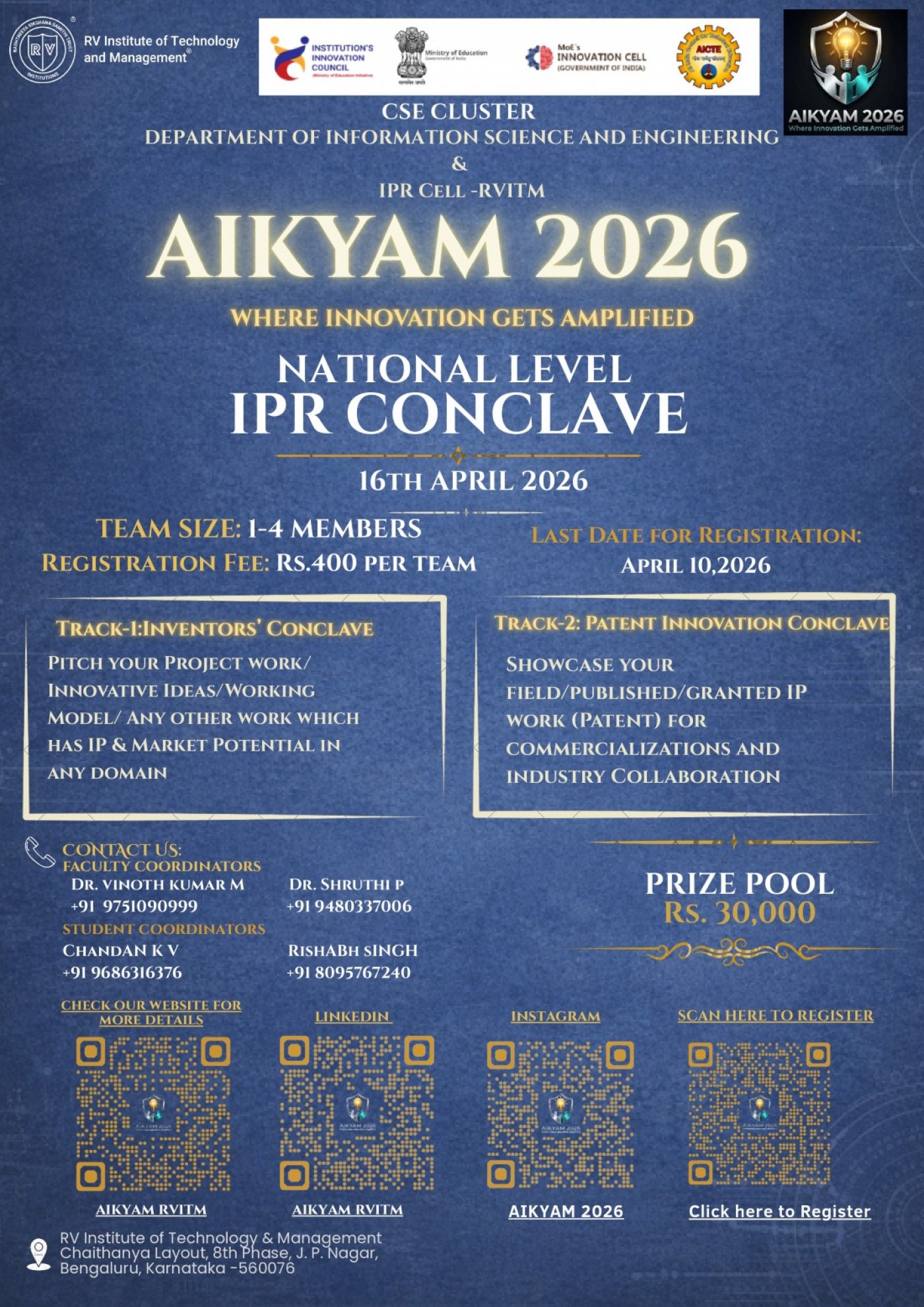 The Department of Information Science and Engineering, RVITM, Bengaluru, and IPR Cell-RVITM is delighted to inform you that we are organizing a AIKYAM-2026 -National Level IP Conclave