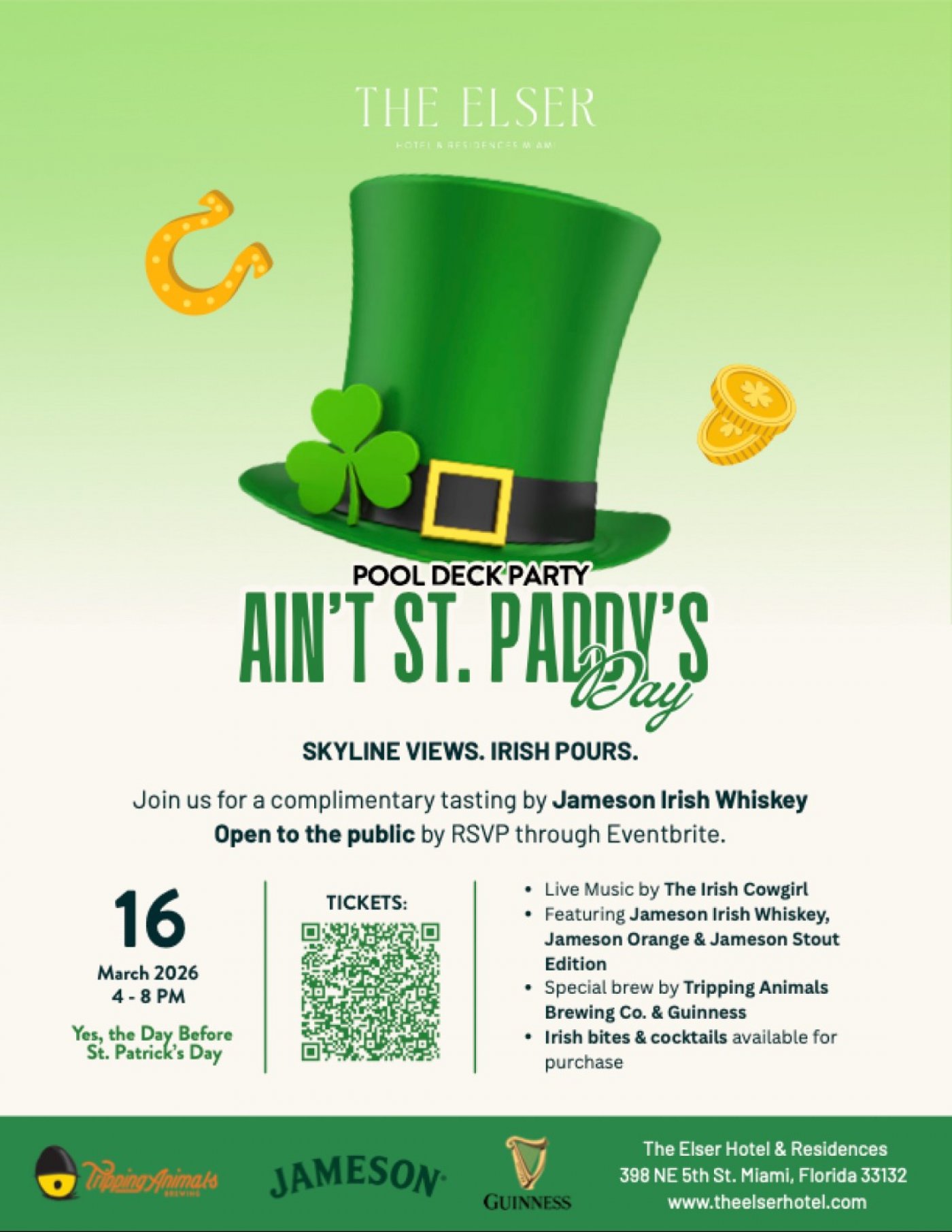 The Elser Hotel & Residences, a vibrant 49-story luxury tower in Downtown Miami, is hosting “Ain’t St. Paddy’s Day” on Monday, March 16, inviting guests to kick off St. Patrick’s Day celebrations with a festive pool deck party from 4-8 p.m. Live entertainment will be led by The Irish Cowgirl Clar Killoran and The Free Folkers Band from 4:30-7:30 p.m., bringing high-energy Irish flair to the afternoon. A complimentary tasting sponsored by Jameson will feature Jameson Irish Whiskey, Jameson Orange and Jameson Stout, alongside special brews from Tripping Animals Brewing Co. and Guinness. Irish-inspired bites and themed cocktails will be available for purchase. This event is free and open to the public. RSVP is required. All attendees must check in at the lobby for elevator access. Reserve your spot at https://www.eventbrite.com/e/aint-saint-pattys-day-tickets-1984079544327?aff=oddtdtcreator