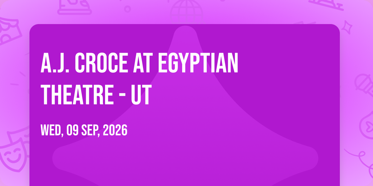 ✨ Discover the extraordinary at A.J. Croce at Egyptian Theatre - UT, where magic meets reality in ways you've never imagined! 🏛️ Set in Egyptian Theatre - UT nestled in bustling Park City, UT, this event promises to be a landmark occasion. 📅 Taking place on September 9th, 2026 at 08:00 PM, it's going to create an atmosphere where every moment becomes a cherished memory. 🌟 Immerse yourself in an experience crafted with attention to every detail, designed to surprise and delight at every turn. They have worked tirelessly to ensure this event exceeds all expectations, bringing together elements of entertainment, innovation, and pure joy. 🎊 Don't miss your chance to be part of this remarkable journey!