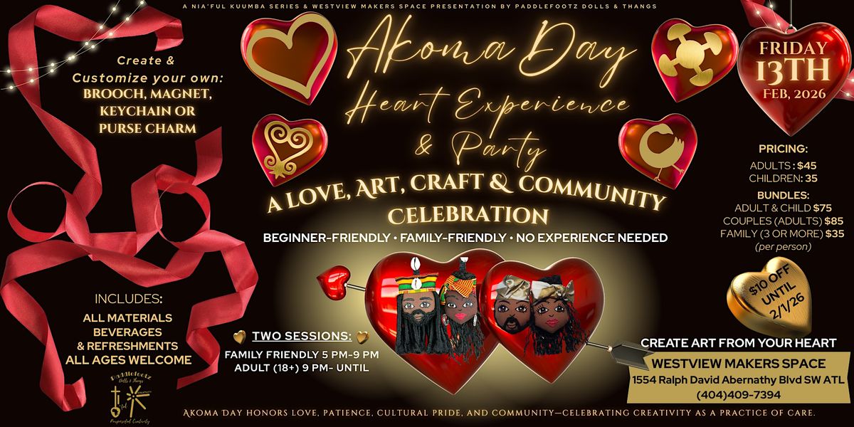 Akoma Day (also known as Black Love Day) honors the heart—love of self, love of family, love of community, and love of culture. This creative gathering invites children, adults, couples, and families to celebrate Akoma through art, presence, and connection.