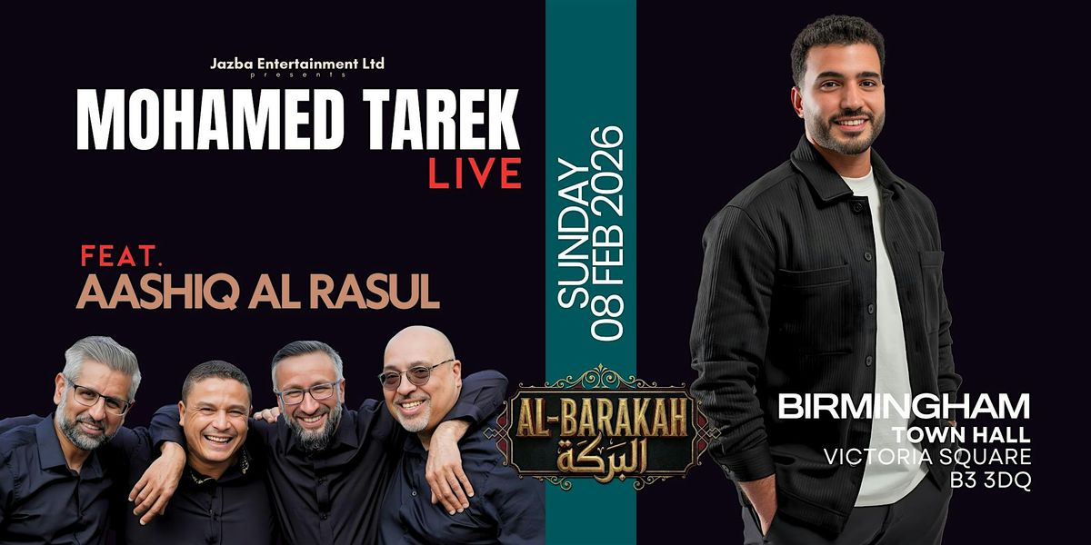 Experience an unforgettable spiritual evening as global nasheed sensation Mohamed Tarek returns to the UK with his uplifting Sufi-inspired vocals. Joining him on stage are Birmingham’s own Aashiq Al Rasul, the acclaimed nasheed group known for their powerful harmonies and soulful performances. This family-friendly, alcohol-free event brings together timeless spirituality and contemporary artistry in a breathtaking live concert at Town Hall Birmingham as well as in London and Bradford. A perfect night for all ages to celebrate faith, culture and uplifting music. It's all about vibes, faith, and good energy. Don't miss out on this amazing live experience where inspiration meets the soul. See you there!
