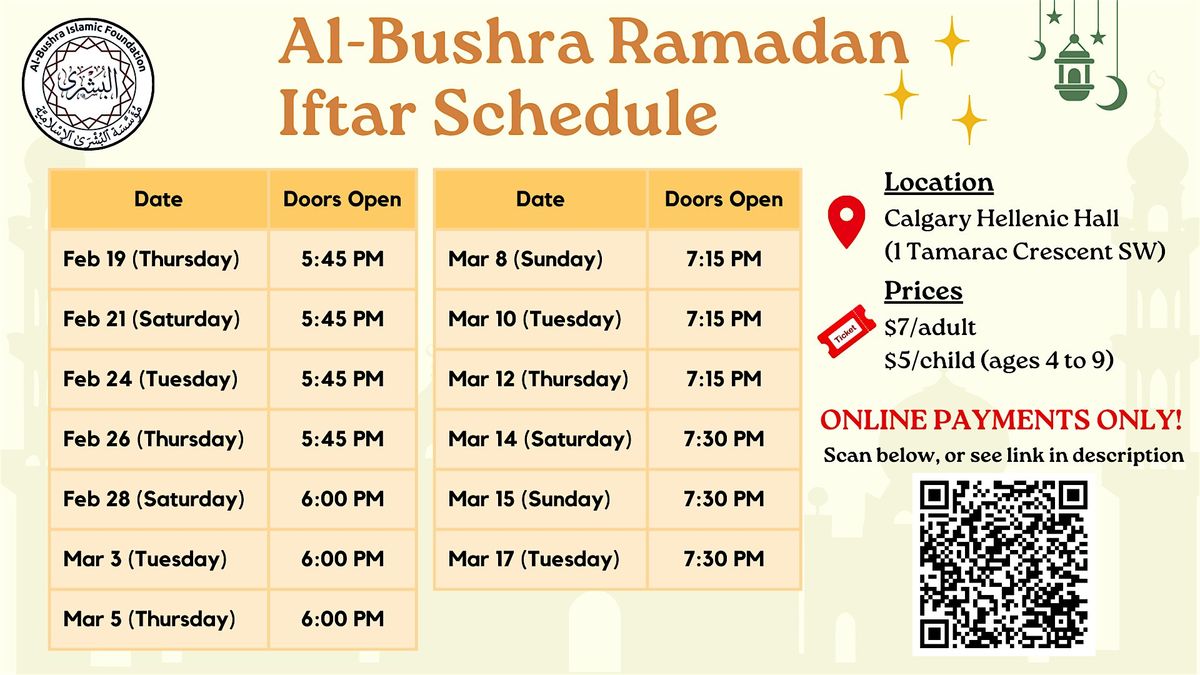 Al-Bushra Islamic Foundation is pleased to offer community iftar gatherings throughout Ramadan 2026. These events provide an opportunity to break the fast together, enjoy good food, and strengthen bonds within our community. Join us for many evenings of great company, meaningful connection, and the warm spirit of Ramadan!
